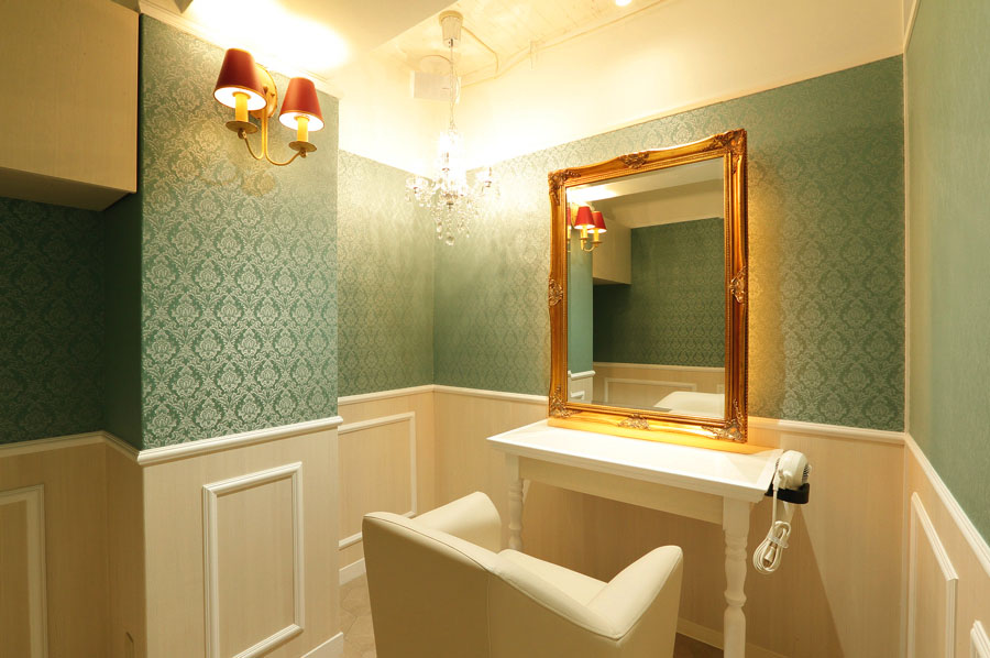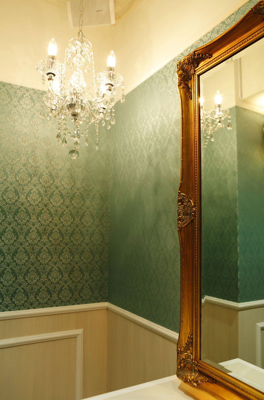 セットミラー、窓格子各所にはロココ調の装飾を施し、上品さを演出しています。